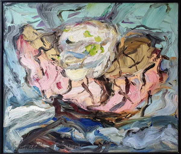 Nog leuker, en bewezen goed voor je brein is het, als je niet direct ziet waar je naar kijkt. Dit figuratief expressionistische werk laat je iedere dag verwonderen. Het duurt even voordat je het taartje erin hebt herkend. De toef slagroom met de limoen zest erbovenop.